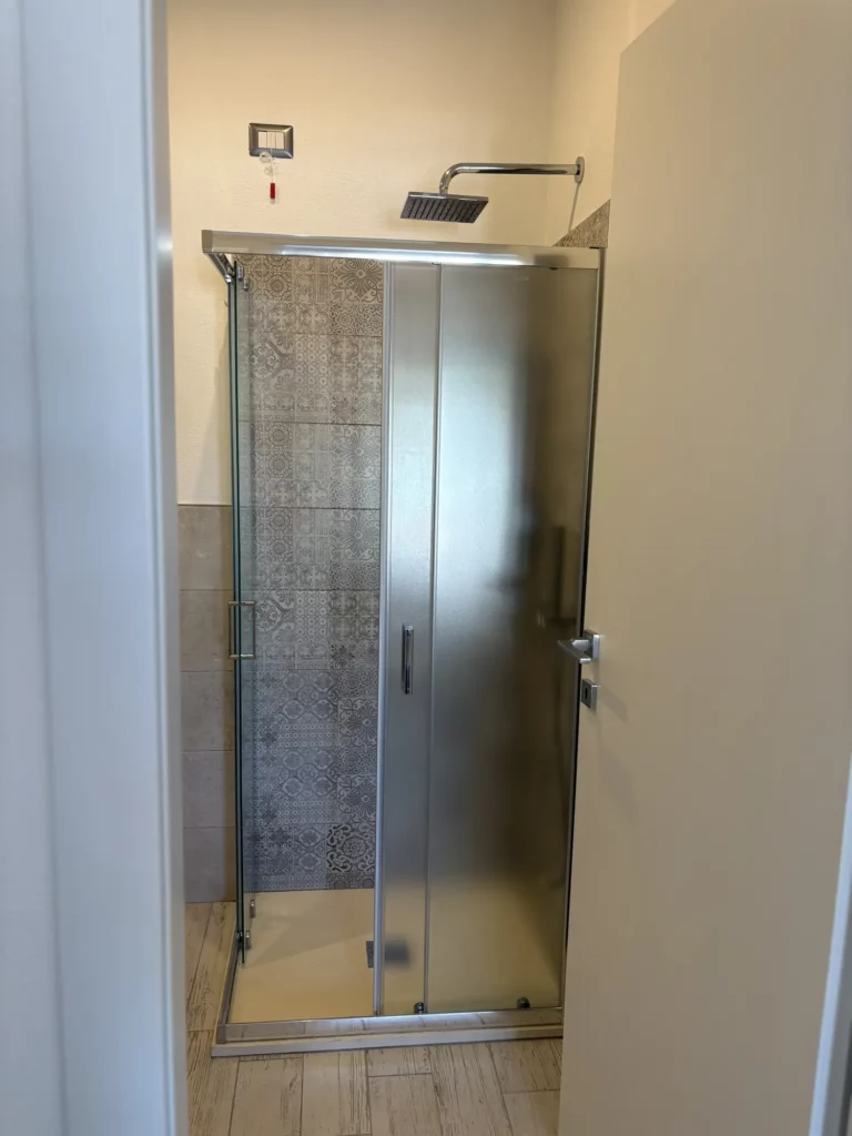 Camera doppia di 14 m2 dotata di aria condizionata, pareti insonorizzate, terrazza con vista cortile interno e bagno privato con doccia.