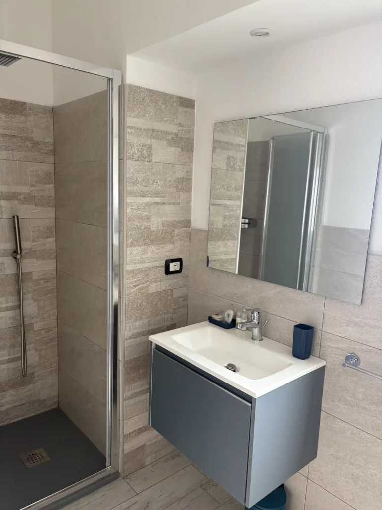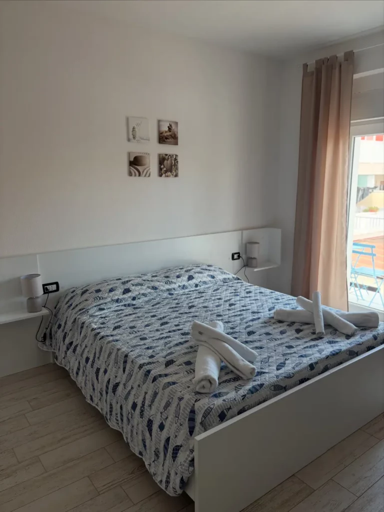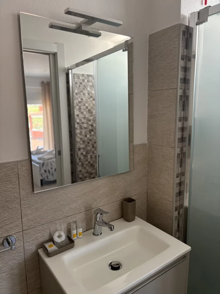 Camera doppia di 14 m2 dotata di aria condizionata, pareti insonorizzate, terrazza con vista mare e bagno privato con doccia.